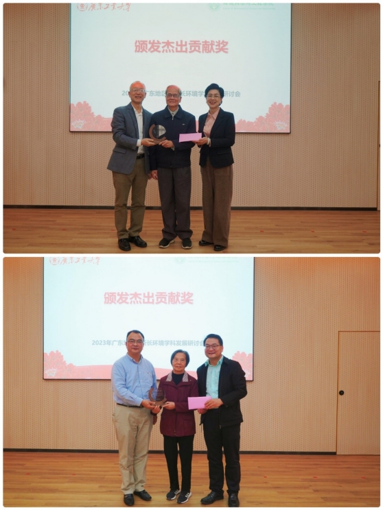 Professor Xiao Jin and Professor Sheng Guoying, 94 years old, were elected as the first outstanding contribution award at this year's conference. Professor Yin Hua and researcher Wang Xinming respectively introduced the achievements of Professor Xiao Jin of South China University of Technology and Professor Sheng Guoying of Guangzhou Institute of Geochemistry, Chinese Academy of Sciences. Professor Dang Zhi, Academician He Hongping, Researcher Yang Yang and Professor an Taicheng presented trophies and prizes to the two professors respectively, affirming their outstanding contributions to the environmental discipline of Guangdong Province. The trophies and prizes were sponsored by Guangzhou Hualu Environmental Protection Technology Co., Ltd.
