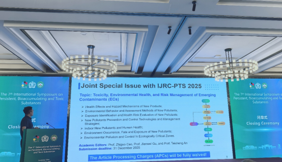 作为会议的合作成果,GES与IJRC-PTS 2025联合宣布设立特刊—“新兴污染物的毒性、环境健康与风险管理”。GES副主编曹治国教授在闭幕式上向与会专家发出投稿邀请,呼吁大家将相关研究成果汇聚于此平台,共同推动新污染物研究的进展。