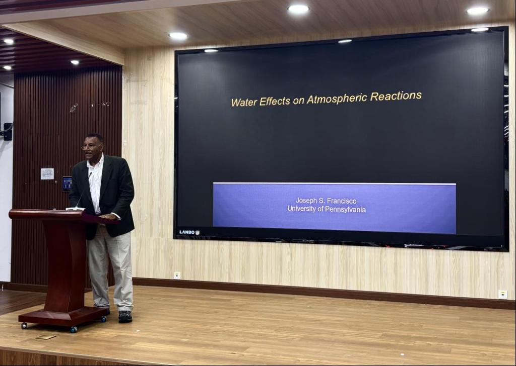论坛伊始,Joseph S. Francisco教授以“水对大气化学反应的影响机制”为主题展开报告。他指出,水作为大气中含量最丰富的资源之一,因其兼具氢键供体与受体的特性,能形成稳定的复合物,进而显著影响大气中的化学反应过程。报告重点围绕水对气相反应的实验与理论研究展开,涵盖大气物种的非均相去除、光化学性质改变、水滴与气溶胶颗粒形成等关键环节。Joseph教授表示,本次分享旨在通过解析水化学的基础概念,为理解大气中水化学的全球影响提供理论框架,助力环境科学领域的跨尺度研究。